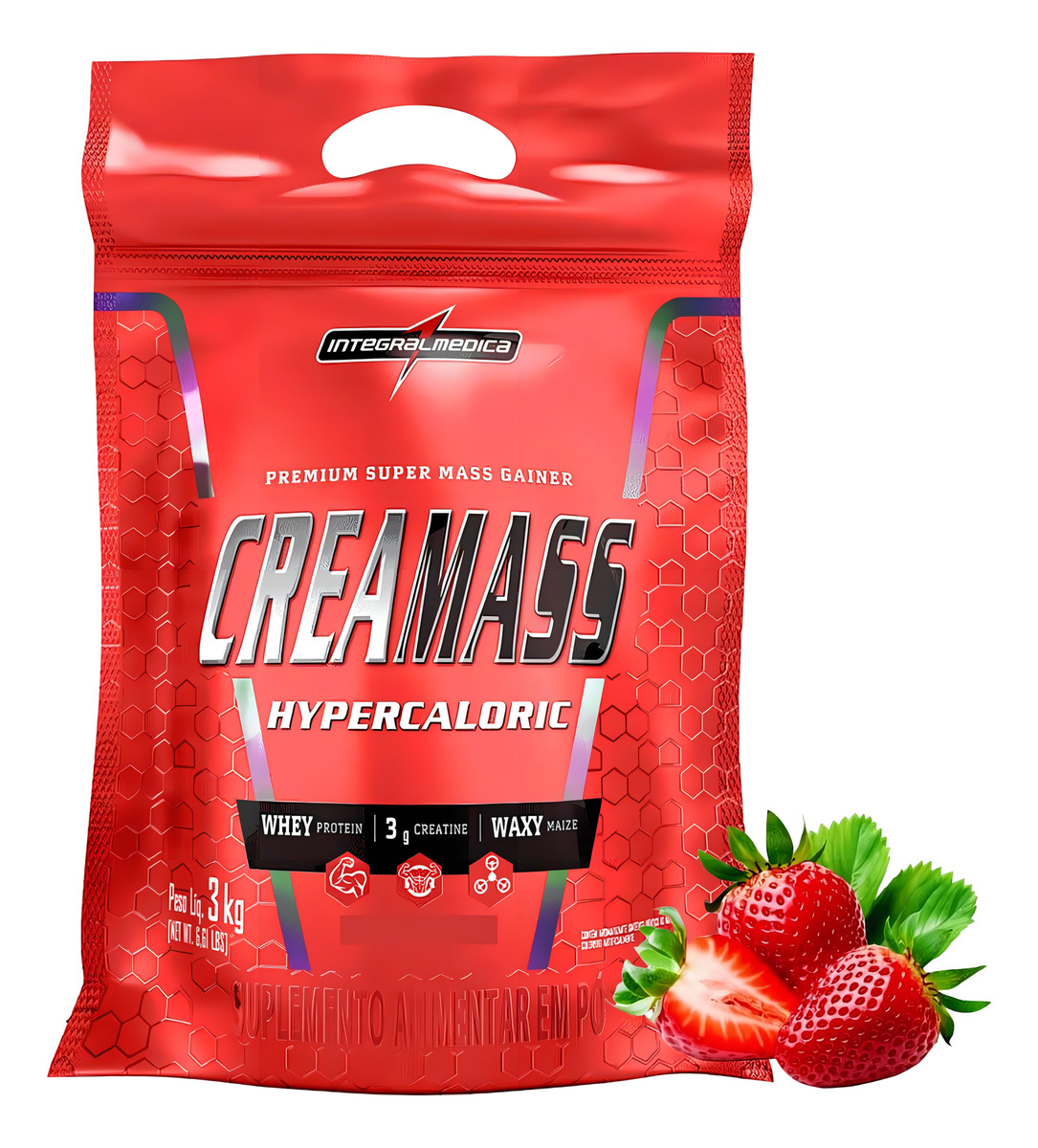CREAMASS HIPERCALÓRICO INTEGRALMÉDICA 3KG Perfeito para a sua busca por um ganho efetivo de massa muscular demanda treinos constantes e um aporte calórico compatível. É fundamental que esse aporte seja feito de modo estratégico e balanceado,creamass fornece adequadamente a ingestão de um carboidrato de energia rápida (maltodextrina) e outro de liberação gradual (waxy maize). Além de uma combinação inteligente de duas proteínas de alto valor biológico (whey protein concentrado e whey protein isolado), a fórmula também oferta creatina (3 g por porção), composto relacionado à explosão muscular, necessária durante os treinos, e também ao aumento de massa muscular. BENEFÍCIOS DO CREAMASS HIPERCALORIC: - Ganho de Massa Muscular - Ganho de Força - Aporte calórico - Reposição de carboidratos utilizados durante o treino - Aumento de performance INFORMAÇÃO NUTRICIONAL: Porção: 160 g (4 dosadores) Valor energético (kcal): 609 Carboidratos (g): 134 Açúcares totais (g): 27 Açúcares adicionados (g): 6,6 Proteínas (g): 15 Gorduras totais (g): 1,5 Gorduras saturadas (g): 0,9 Gorduras trans (g): 0 Fibras alimentares (g): 0 Sódio (mg): 221 Creatina (mg): 3000 INGREDIENTES: Maltodextrina, proteína de soro do leite concentrada, amido de milho (Zea mays), creatina monohidratada, proteína de soro do leite isolada e aromatizante e edulcorante sucralose. ALÉRGICOS: CONTÉM DERIVADOS DE LEITE E SOJA*. CONTÉM LACTOSE. NÃO CONTÉM GLÚTEN. DIABÉTICOS: CONTÉM GLICOSE. *Ingrediente utilizado no processo de fabricação da proteína do soro de leite com função de instantaneização. PARA QUE SERVE O HIPERCALÓRICO: Creamass Integralmédica é indicado para quem deseja aumentar o peso corporal através do ganho de massa muscular. Como é uma fonte calórica de proteínas e carboidratos de alta qualidade, além da creatina presente em sua composição, a suplementação com o hipercalórico da CREAMASS auxilia no aumento do volume e na intensidade do treinamento, proporcionando níveis de treinamento nunca alcançados. É indicado principalmente para pessoas que buscam um off season aonde o peso corporal e a carga de treinamento aumentem em níveis máximos. - Melhora do desempenho - Ganho de massa muscular - Ganho de força COMO TOMAR: CREAMASS pode ser consumido entre as refeições ou á qualquer momento do dia. Desde que esteja alinhado com os objetivos de ganho de massa muscular e força. Por ser uma fórmula altamente calórica, seu consumo pode ser feito como substituto de refeições de maneira prática e saborosa. - Qualquer momento do dia - Entre as refeições MAIORES DÚVUDAS SOBRE O PRODUTO: 1. A quem o produto é destinado? Os hipercalóricos são produtos destinados a pessoas que desejam aumentar o ganho de peso e massa muscular através do aporte calórico, proteínas e carboidratos diários. 2. Quais são os benefícios de um suplemento hipercalórico? Os principais beneficios de um produto hipercalórico é o aumento de massa e volume muscular, além da reposição de macronutrientes após treinos intensos e longos. 3. Quando se deve tomar um suplemento hipercalórico? Os hipercalóricos podem ser consumidos entre as refeições com objetivo de aumento da ingestão calórica, de carboidratos e proteínas diárias e após o treino para otimizar a recuperação muscular. 4. Para que serve um suplemento hipercalórico? O hipercalórico é um suplemento que serve como complemento a dieta de pessoas que buscam o aumento de calorias diárias, peso corporal e massa muscular. Além de ser um suplemento que fornece energia e promove a recuperação muscular.