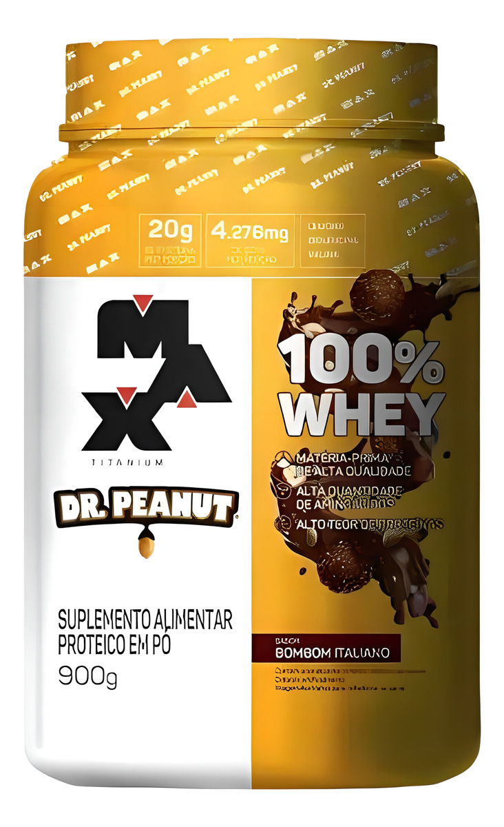 100% WHEY da Max Titanium em colaboração com a Dr. Peanut é a proteína ideal para quem busca performance e sabor em um único suplemento. Quem conhece a Dr. Peanut sabe de sua qualidade associada aos sabores incríveis e trouxemos isso para o Whey da Max. Sua formulação à base de proteína concentrada do soro do leite (Whey Protein Concentrate), auxilia na formação dos músculos e ossos. Com sabores exclusivos e campeões de vendas da Dr. Peanut, é elaborado com matéria-prima de alta tecnologia e valor biológico, trazendo rápida digestibilidade e elevada concentração de aminoácidos essenciais. Recomendação de uso Utilize de uma a duas porções ao dia, ou conforme orientação profissional. Indicado para pessoas de 9 a 18 anos e maiores de 19 anos. Ingredientes Sabor : Avelã Proteína concentrada do soro do leite (WPC), amendoim torrado e granulado, cacau alcalino em pó, sal, aromatizantes, corante artificial caramelo IV, espessantes goma xantana e goma guar e edulcorante sucralose. CONTÉM GLÚTEN. Sabor : Bueníssimo Proteína concentrada do soro do leite (WPC), amendoim torrado e granulado, cacau alcalino em pó, sal, aromatizantes, corante artificial caramelo IV, espessantes goma xantana e goma guar e edulcorante sucralose. CONTÉM GLÚTEN. Sabor : Paçoca Proteína concentrada do soro do leite (WPC), amendoim torrado e granulado, sal, aromatizante, espessantes goma xantana e goma guar e edulcorante sucralose. CONTÉM GLÚTEN. Benefícios 20g de proteína por porção Até 4.417mg de BCAA por porção Alta quantidade de aminoácidos Matéria-prima de alta qualidade High protein Modo de Preparo Modo de preparo para o shake: Para o preparo de uma porção, misture 40g (2 dosadores cheios*) do produto em 200mL (1 copo) de água ou outra bebida de sua preferência (leite integral ou desnatado, por exemplo) com o auxílio de um liquidificador ou coqueteleira. Modo de preparo para o creme proteico: Em uma taça de sobremesa, adicione 30mL de água (3 colheres de sopa) em 40g do produto (2 dosadores cheios*). Misture até ficar um creme homogêneo. Refrigere por 15 minutos. *A quantidade da porção no dosador pode variar em função da densidade e outras características do produto. Advertências “ESTE PRODUTO NÃO É UM MEDICAMENTO”. “NÃO EXCEDER A RECOMENDAÇÃO DIÁRIA DE CONSUMO INDICADA NA EMBALAGEM”. “MANTENHA FORA DO ALCANCE DE CRIANÇAS” Alergênicos CONTÉM AMENDOIM E DERIVADOS DE LEITE. PODE CONTER SOJA E OVO.